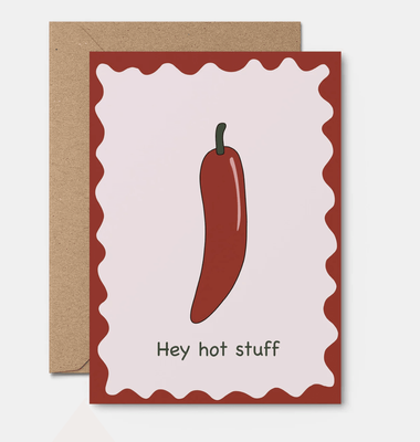 Spice up your Anniversary or someone's Birthday with this adorable greeting card! Featuring a vibrant chilli and the playful message, “Hey Hot Stuff,” this card is perfect for sharing some love and laughter. Whether you're sending it to a partner, crush, or friend, it’s sure to add a fun twist to your heartfelt wishes. Ideal for anyone who loves a little heat! ️