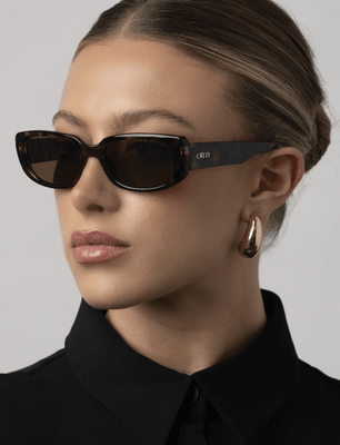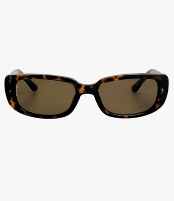 With a bold, curved tortoiseshell frame that follows the contours of the face, these sunglasses create a dynamic, almost futuristic silhouette. Paired with warm brown lenses.