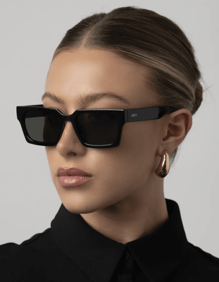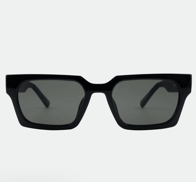 A squared frame in polished black, paired with green lenses for a subtle touch of modern edge.