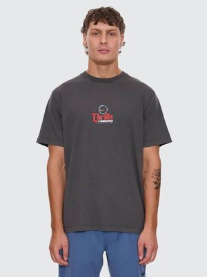 Vintage edge meets everyday wear in the Banquet Merch Fit Tee in Merch Black. Cut in a regular merch fit with a ribbed crew neck, this men's black tee is easy through the body, offering a sturdy yet breathable in lightweight dry-hand cotton jersey construction. Front and back crackle prints add a lived-in, Thrills finish, while the washed black shade keeps it endlessly versatile. Whether worn with denim jeans or cargo shorts, this is a solid men's graphic tee to add to your everyday staples.