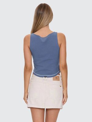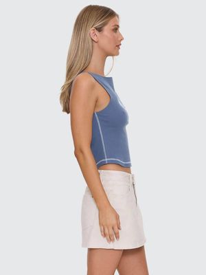 Set the pace with the Track Record Tank in Bluefin bringing a slick, race-day energy with a slim, cropped cut and a clean boat neck that skims the collarbones. Made from stretchy 1x1 fine-rib cotton-elastane, it moves with you and keeps its shape, while the front chest print lays down the winning Thrills appeal. Light, sleeveless, and ready for repeat wear, this women's tank top is perfect with mini skirts or baggy denims for easy off-duty streetwear.